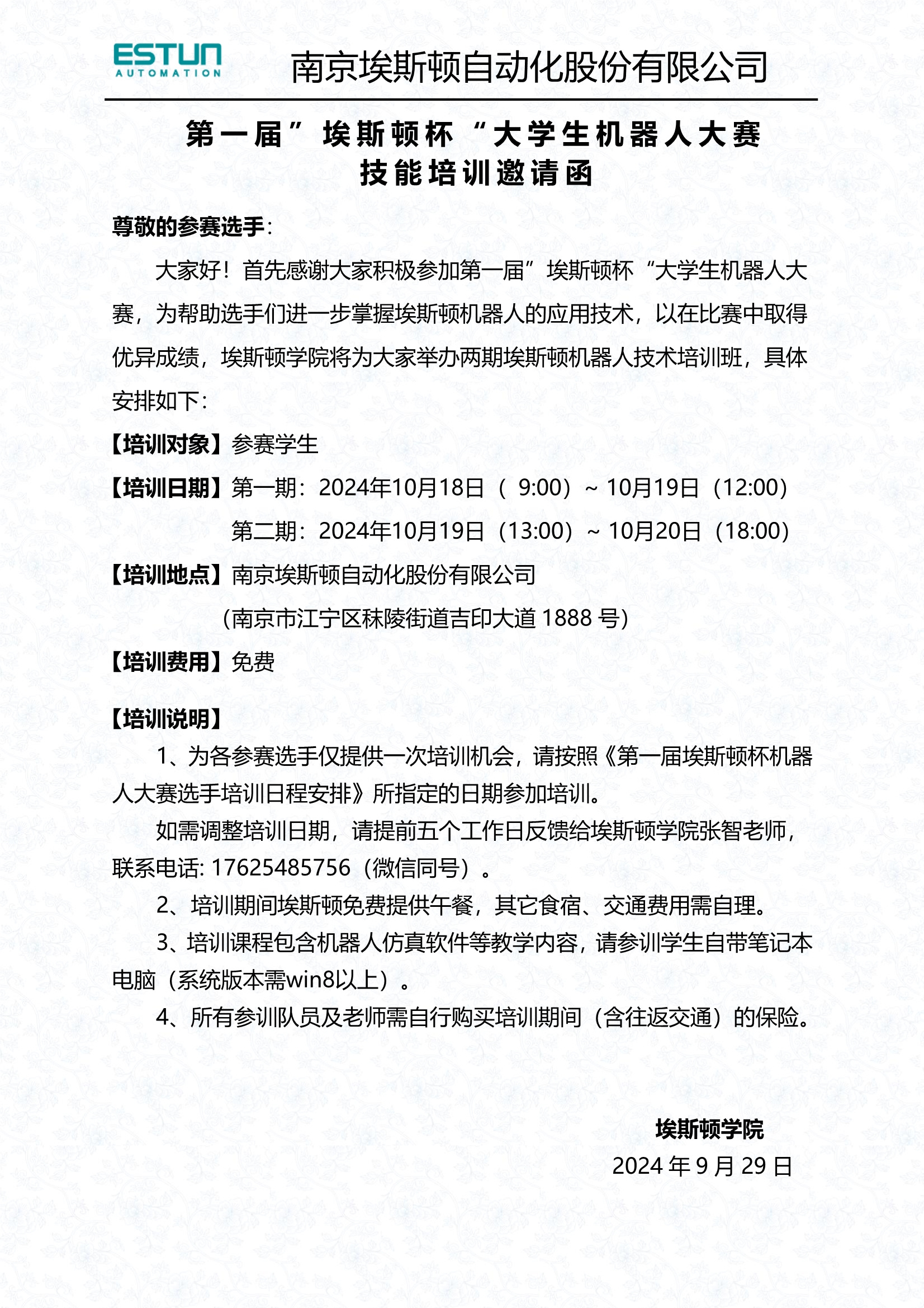第一届“埃斯顿杯”大学生机器人大赛技能培训通知